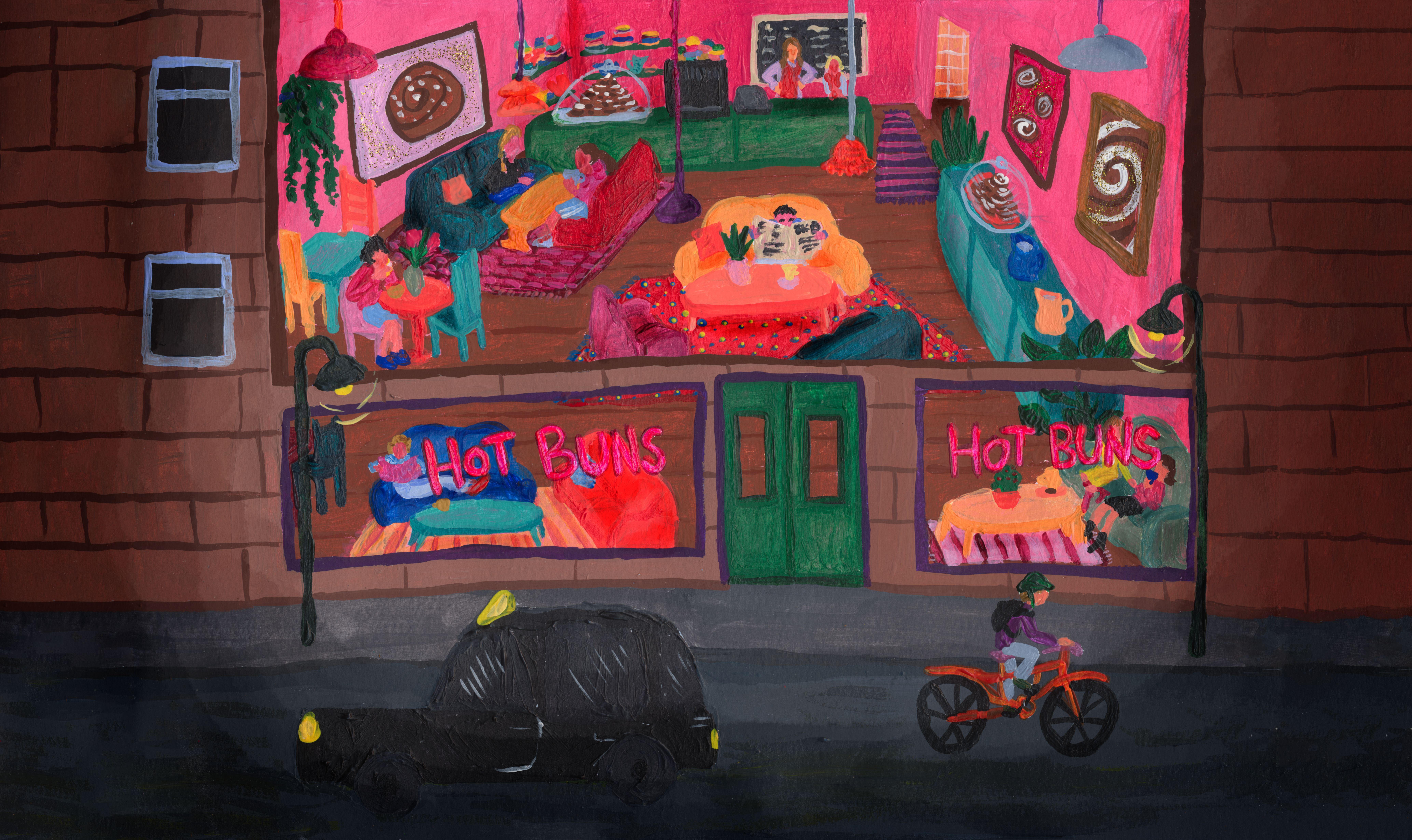 Eat With Your Eyes is a darkly comedic auto-fiction. The film follows Jenny, who gets handed her own café, café Hot Buns, when the owner is arrested and imprisoned. Jenny is not told why, and instead instructed to act normal and keep baking her big beautiful buns. As it happens, Jenny is already a bit of an expert when it comes to pretending all is well – on a night out, she has been drugged and has ever since been convincing herself she does not remember what happened and even if she did, it’s nothing bad. Throughout the film, Jenny and the café act as in symbiosis, bursting in the seams with evidence of wrongdoing while trying to appear happy and normal. Eventually, everything comes to a boiling point. Jenny is forced to accept reality – a reality that she remains free to form into whatever she wants but that comes with a side of scarring.